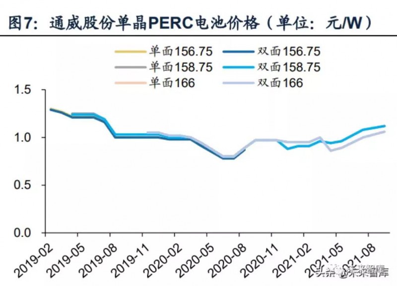 單雙面電池/組件幾乎同價,雙面增益滲透率不斷提升。根據(jù)Wind,通威股份PERC單雙面電池片報價已趨于一致。根據(jù)Solarzoom,一線廠商單雙面組件成交價差也在0.02元/W以內(nèi)。由于雙面組件背面發(fā)電增益帶來的性價比提升,滲透率正在快速提升,根據(jù)CPIA統(tǒng)計,雙面組件市場份額已從2018年的2%提升至2020年的30%,預計2025年有望達到60%以上。