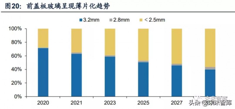 超薄光伏玻璃減少原片使用,助力降本同時順應雙面組件輕量化需求,有望成為雙玻組件主流產(chǎn)品。超薄光伏玻璃節(jié)省原片使用量,價格相對傳統(tǒng)光伏玻璃更低,市場份額將伴隨雙玻組件滲透逐年提升。根據(jù)CPIA統(tǒng)計,2020年2.5mm及以下厚度的前蓋板玻璃市占率約為29%,2025/2030年有望提升至47%/56%。