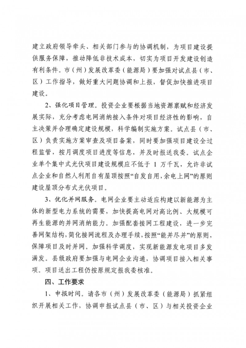 已納入國(guó)家試點(diǎn)的12個(gè)整縣屋頂分布式光伏試點(diǎn)縣,如縣(市、區(qū))政府和原開(kāi)發(fā)企業(yè)按要求達(dá)成合作并按時(shí)上報(bào)相關(guān)材料的,可將試點(diǎn)范圍擴(kuò)大至含地面分布式和集中式在內(nèi)的全部光伏項(xiàng)目,一并納入試點(diǎn)范圍。