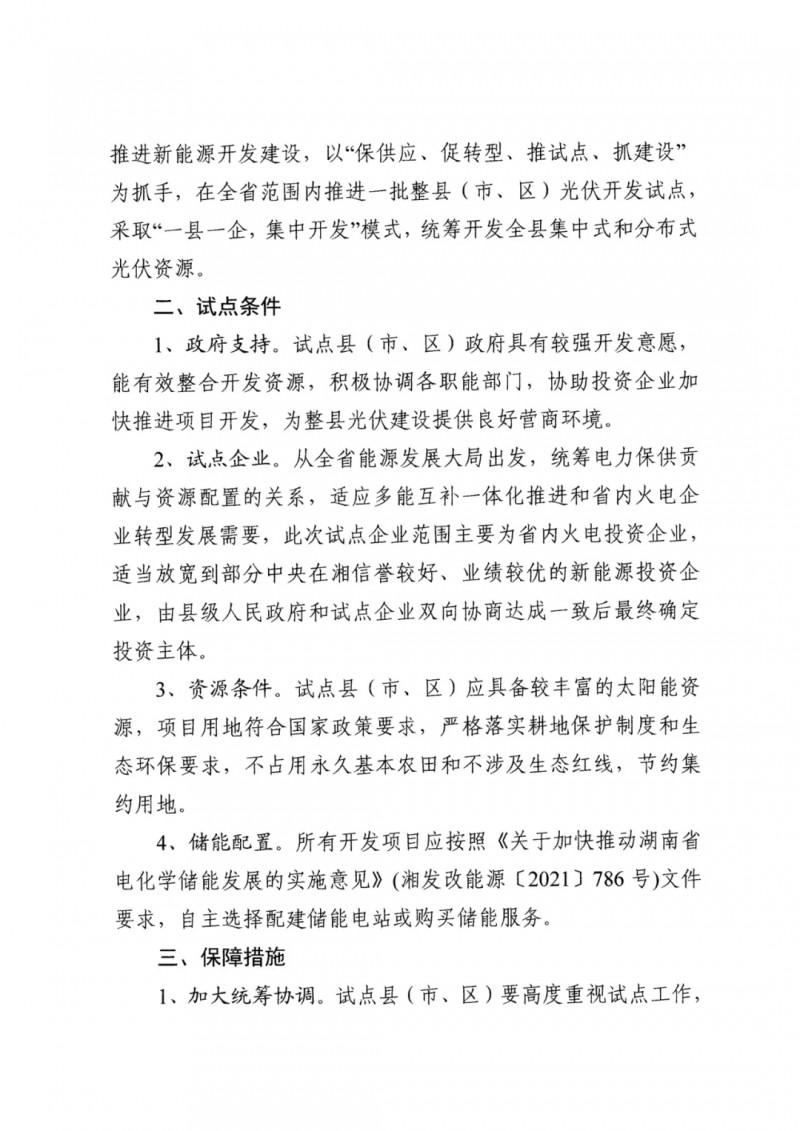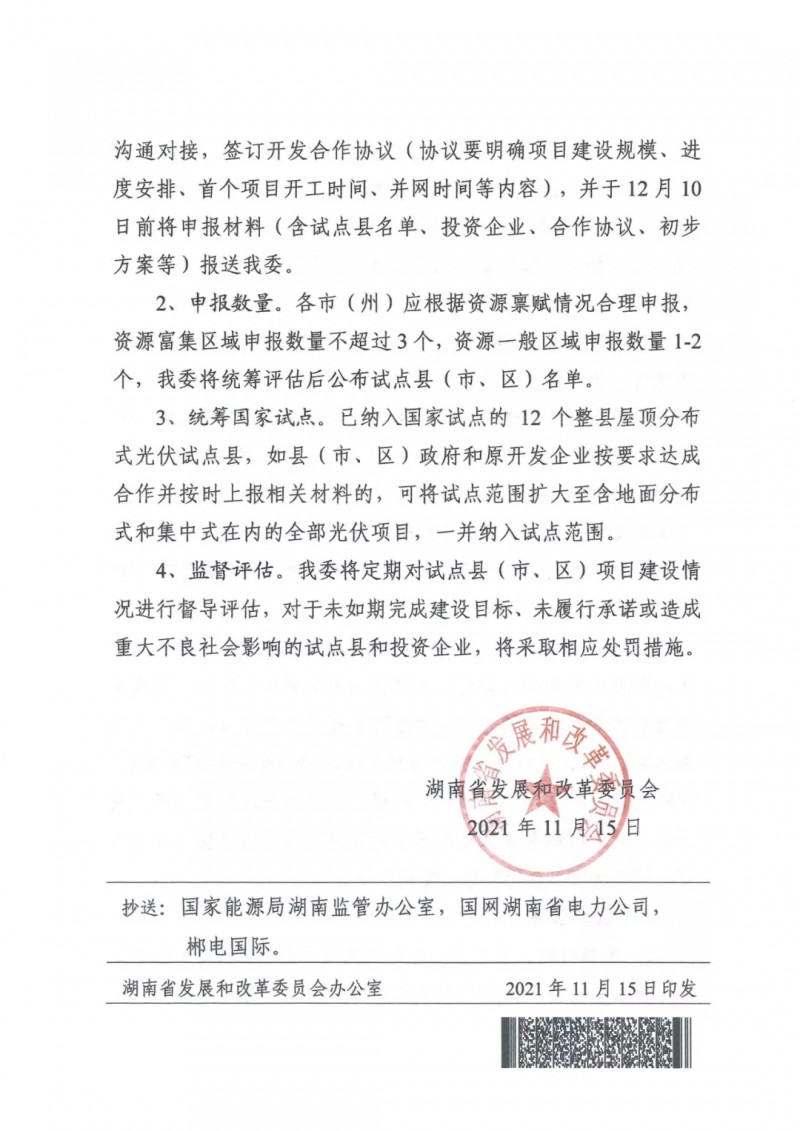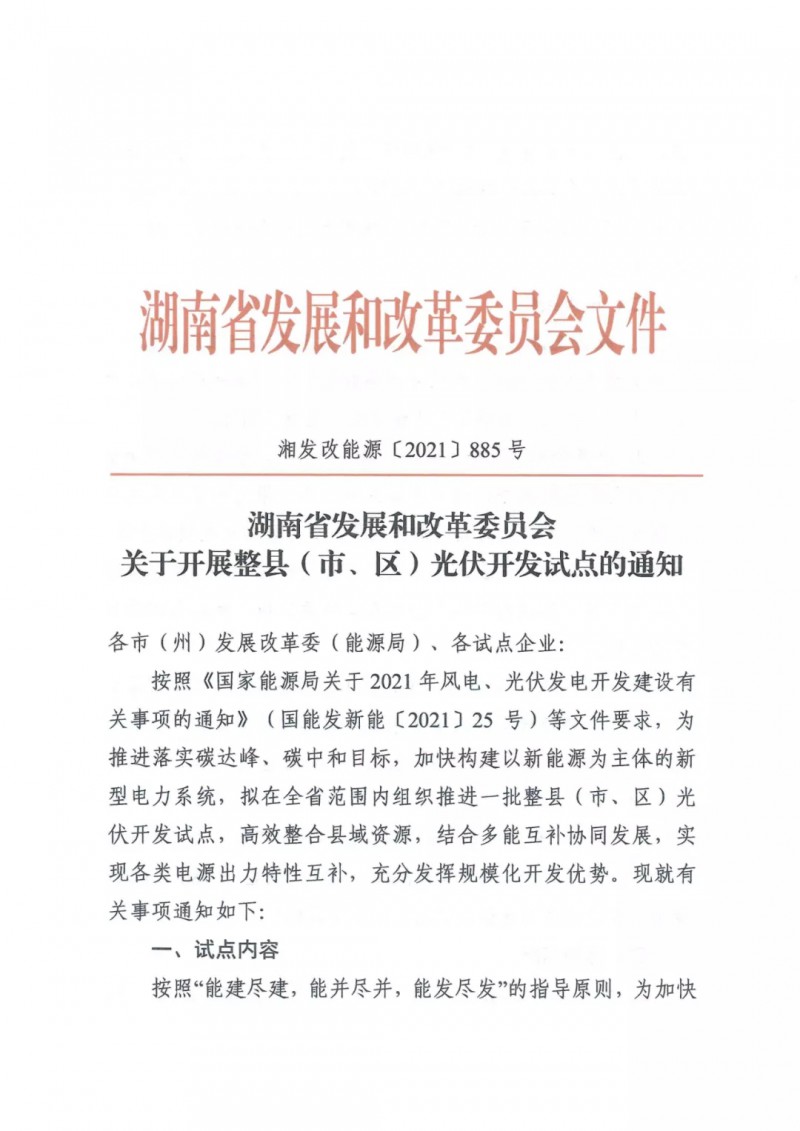 11月15日,湖南省發(fā)改委下發(fā)《關(guān)于開(kāi)展整縣(市、區(qū))光伏開(kāi)發(fā)試點(diǎn)的通知》,擬在全省范圍內(nèi)組織推進(jìn)一批整縣(市、區(qū))光伏開(kāi)發(fā)試點(diǎn),高效整合縣域資源,結(jié)合多能互補(bǔ)協(xié)同發(fā)展。