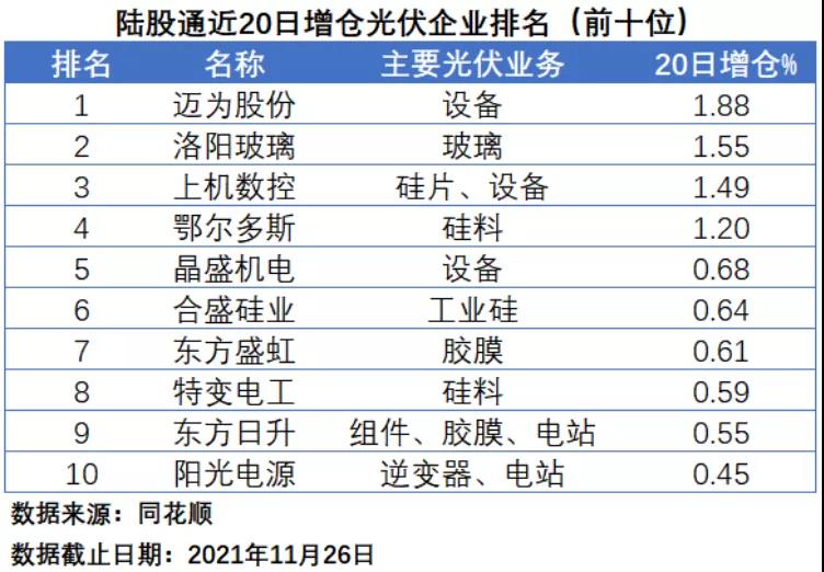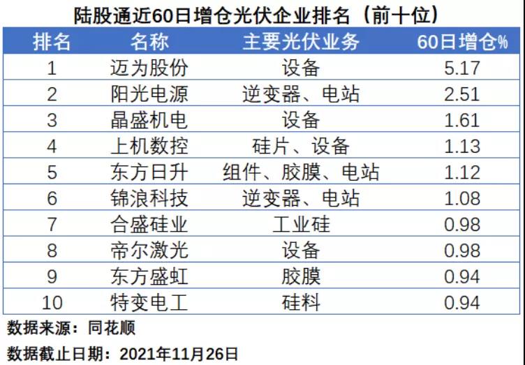 在陸股通近60日增倉排名中,邁為股份、陽光電源和晶盛機電分居前三位,增倉幅度分別為5.17%、2.51%和1.61%,其中邁為股份和晶盛機電均為光伏設備企業(yè),前者的核心產品為太陽能電池絲網印刷生產設備,后者主營產品為晶體生長設備。上機數(shù)控、東方日升、錦浪科技、合盛硅業(yè)、帝爾激光、東方盛虹和特變電工分居第四到第十位。前十名中,涉足光伏設備業(yè)務的企業(yè)高達4家,涉足電站業(yè)務的企業(yè)為3家。