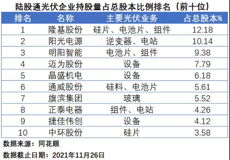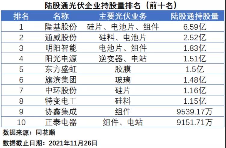 在陸股通持股量排名中,截止到11月26日收盤(下同),隆基股份憑借自身超強的綜合實力以及較高的總股本規(guī)模最受“北向資金”的青睞,以6.59億的持股量位居第一,通威股份和明陽智能分別以2.52億和1.83億位居第二和第三。陽光電源、東方盛虹、旗濱集團、中環(huán)股份、特變電工的持股量均在1億股以上。在前十名中,共有4家企業(yè)涉足組件業(yè)務,3家企業(yè)涉足電池片業(yè)務,涉足硅料、硅片業(yè)務的企業(yè)各有2家。
