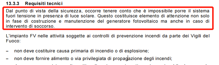 意大利標(biāo)準(zhǔn) CEI 82-25標(biāo)準(zhǔn)明確指出:“從安全的角度來看,必須考慮到在有陽光的情況下無法安全關(guān)閉光伏系統(tǒng)的情況。這不僅是光伏發(fā)電系統(tǒng)的建造和維護(hù)階段的一個(gè)注意事項(xiàng),而且在緊急干預(yù)的情況下也是如此。”