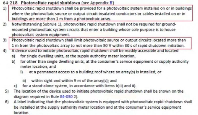 另外,法規(guī)中還規(guī)定了:當(dāng)光伏系統(tǒng)安裝在建筑內(nèi)或者建筑上,應(yīng)安裝快速關(guān)斷裝置。在光伏組件1米外,快速關(guān)斷裝置觸發(fā)后,要求30S內(nèi)將電壓降低至30V以下。