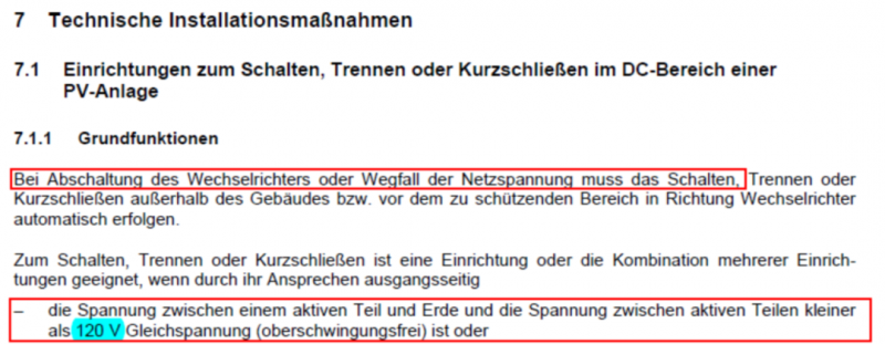 根據(jù)德國標(biāo)準(zhǔn) VDE-AR-E 2100-712要求:在光伏系統(tǒng)中如果逆變器關(guān)閉或者電網(wǎng)出現(xiàn)故障時(shí),需要使直流電壓小于120V。其中,提到了可以使用關(guān)斷裝置使直流側(cè)電壓降至120V以下。