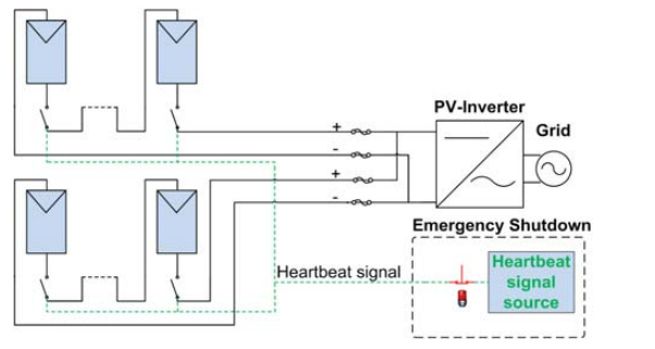根據(jù)安徽省質(zhì)量技術(shù)監(jiān)督局發(fā)布的《建筑光伏系統(tǒng)防火技術(shù)規(guī)范》:建筑光伏系統(tǒng)應(yīng)設(shè)置快速關(guān)斷裝置,且在快速關(guān)閉裝置開始工作的10s內(nèi),受控導(dǎo)線的電壓應(yīng)被限制不超過60V或回路電流應(yīng)被限值不超過1mA。