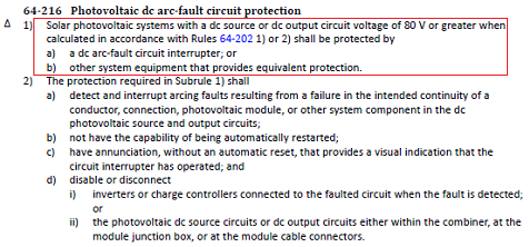 根據(jù)加拿大電氣安裝法規(guī) Canadian Electrical Code 2021版要求:光伏系統(tǒng)直流側(cè)電壓大于80V時(shí)需安裝電弧故障中斷設(shè)備或者其它等同設(shè)備。