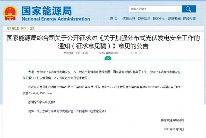 2021年11月26日,國家能源局發(fā)布了關(guān)于公開征求對(duì)《關(guān)于加強(qiáng)分布式光伏發(fā)電安全工作的通知(征求意見稿)》意見的公告。其中,在“項(xiàng)目設(shè)計(jì)管理”相關(guān)章節(jié)中明確要求:安裝電弧故障斷路器或采用具有相應(yīng)功能的組件,實(shí)現(xiàn)電弧智能檢測(cè)和快速切斷功能;光伏組件應(yīng)具有安全關(guān)斷保護(hù)功能,保證逆變器關(guān)機(jī),交流斷電后,系統(tǒng)子陣外直流電壓低于安全電壓。