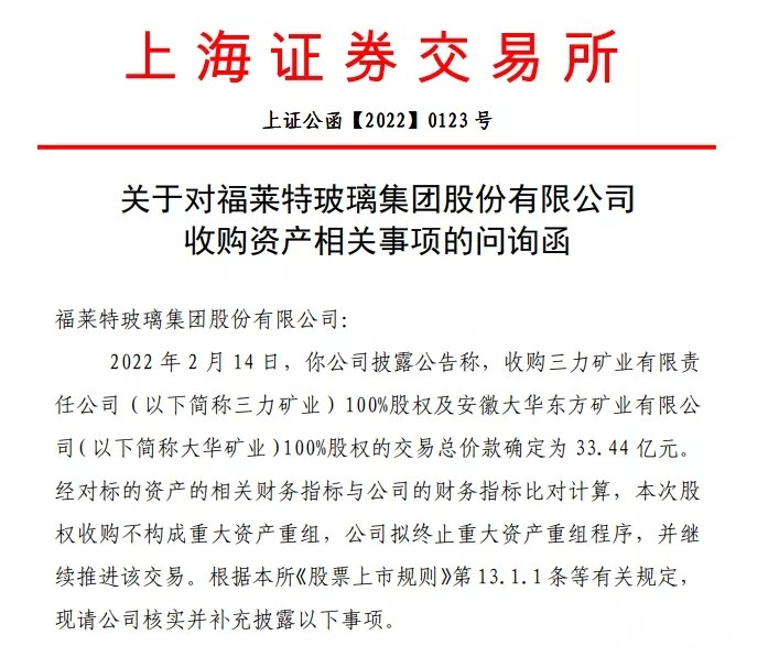 上交所近期發(fā)布問詢函,就光伏玻璃巨頭福萊特對三力礦業(yè)、安徽大華東方礦業(yè)等100%股權的收購案進行問詢,兩項收購額總計為33.44億。