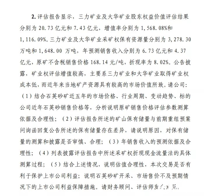 同時,上交所也指出,上述兩家(擬被收購)公司的股東權益價值評估結果分別為20.73億和7.43億,增值率為1568%和1116%,兩家公司的年預測銷售收入為6.73億和4.37億,請福萊特對石英砂礦的近五年市場價、行業(yè)周期、變動趨勢和標的公司近年來石英砂銷售價等,分析說明原礦銷售價評估參數測算依據及合理性。同時也說明年銷售收入的預測依據、估值的合理性等。