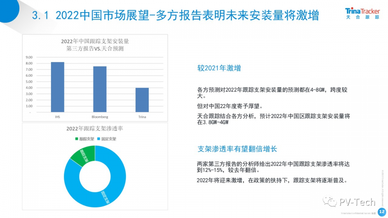 2022年隨著電力消納方式逐漸明朗,大基地項目的落實,大宗商品的供需穩(wěn)定,跟蹤支架的安裝量將有大幅上漲。