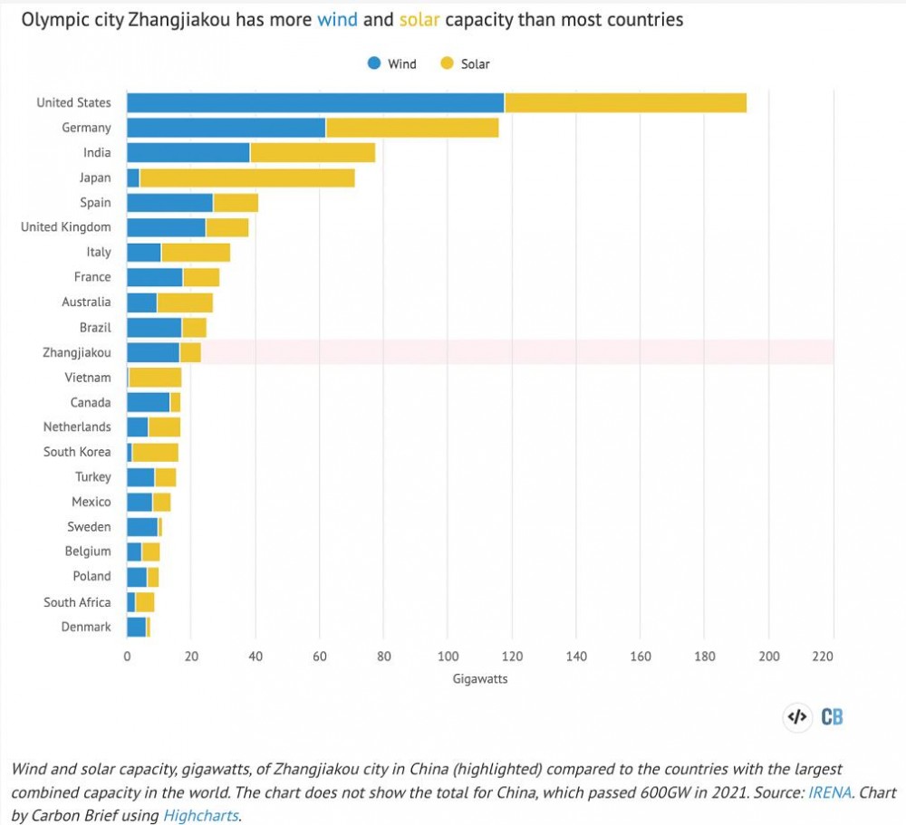 據(jù)報(bào)道:張家口是本屆奧運(yùn)會滑雪項(xiàng)目的主辦城市,其可再生能源容量超過了世界上大多數(shù)國家。