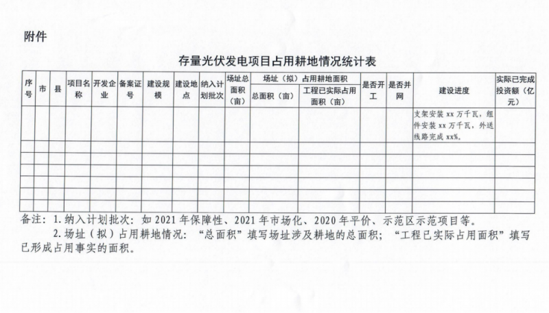 3月11日,河北省能源局啟動存量光伏電站占用耕地摸底統(tǒng)計(jì)工作,文件要求對照自然資源部門土地年度變更調(diào)查數(shù)據(jù)庫,對已列入省年度計(jì)劃、尚未辦理建設(shè)用地審批手續(xù)的存量光伏發(fā)電項(xiàng)目占用耕地情況進(jìn)行摸底統(tǒng)計(jì)。附表信息統(tǒng)計(jì)中包括項(xiàng)目名稱、開發(fā)企業(yè)、備案證號、建設(shè)規(guī)模及地點(diǎn)、納入計(jì)劃批次以及場址總面積、已占用面積以及建設(shè)進(jìn)度等多項(xiàng)詳細(xì)信息。