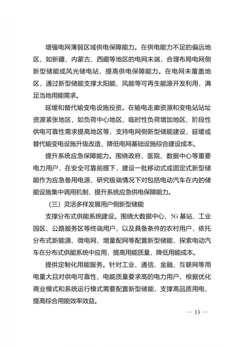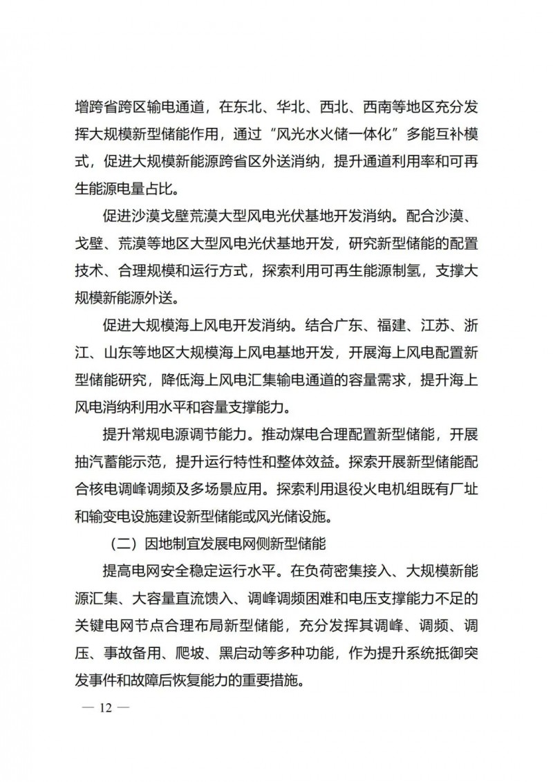 三是以規(guī)?;l(fā)展支撐新型電力系統(tǒng)建設(shè)?!秾?shí)施方案》堅(jiān)持優(yōu)化新型儲(chǔ)能建設(shè)布局,推動(dòng)新型儲(chǔ)能與電力系統(tǒng)各環(huán)節(jié)融合發(fā)展。在電源側(cè),加快推動(dòng)系統(tǒng)友好型新能源電站建設(shè),以新型儲(chǔ)能支撐高比例可再生能源基地外送、促進(jìn)沙漠戈壁荒漠大型風(fēng)電光伏基地和大規(guī)模海上風(fēng)電開發(fā)消納,通過合理配置儲(chǔ)能提升煤電等常規(guī)電源調(diào)節(jié)能力。在電網(wǎng)側(cè),因地制宜發(fā)展新型儲(chǔ)能,在關(guān)鍵節(jié)點(diǎn)配置儲(chǔ)能提高大電網(wǎng)安全穩(wěn)定運(yùn)行水平,在站址走廊資源緊張等地區(qū)延緩和替代輸變電設(shè)施投資,在電網(wǎng)薄弱區(qū)域增強(qiáng)供電保障能力,圍繞重要電力用戶提升系統(tǒng)應(yīng)急保障能力。在用戶側(cè),靈活多樣地配置新型儲(chǔ)能支撐分布式供能系統(tǒng)建設(shè)、為用戶提供定制化用能服務(wù)、提升用戶靈活調(diào)節(jié)能力。同時(shí),推動(dòng)儲(chǔ)能多元化創(chuàng)新應(yīng)用,推進(jìn)源網(wǎng)荷儲(chǔ)一體化、跨領(lǐng)域融合發(fā)展,拓展多種儲(chǔ)能形式應(yīng)用。