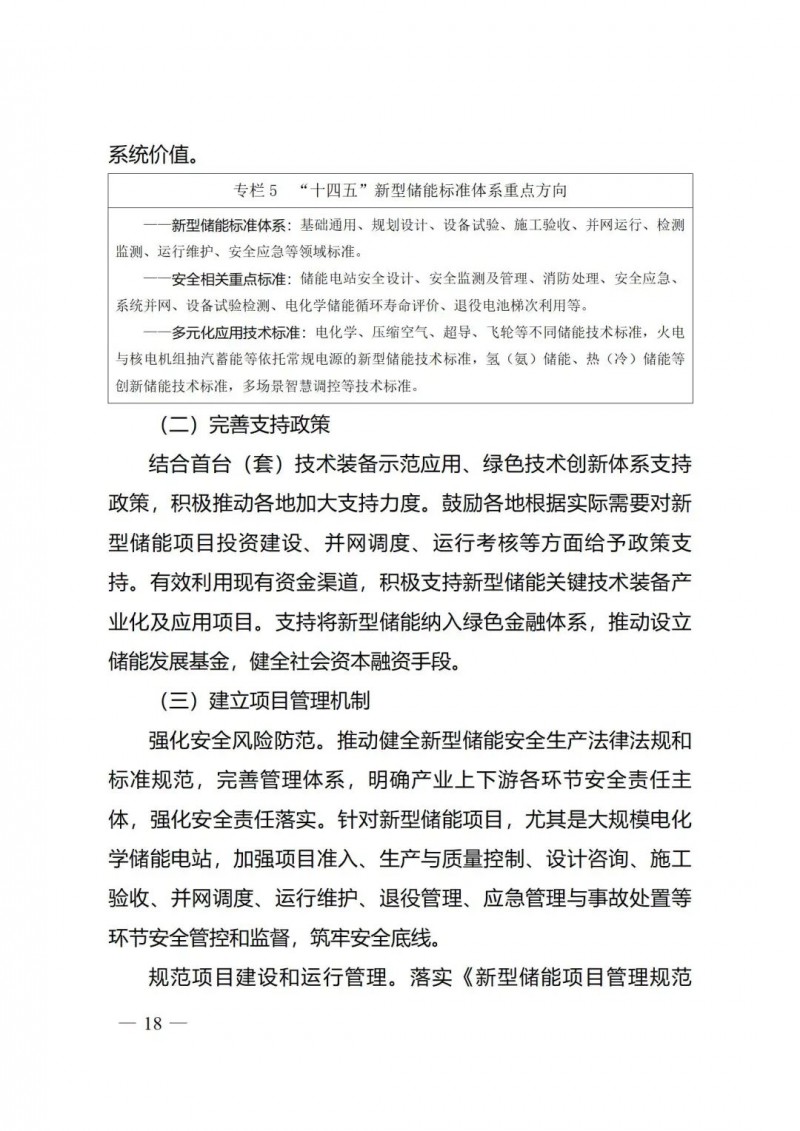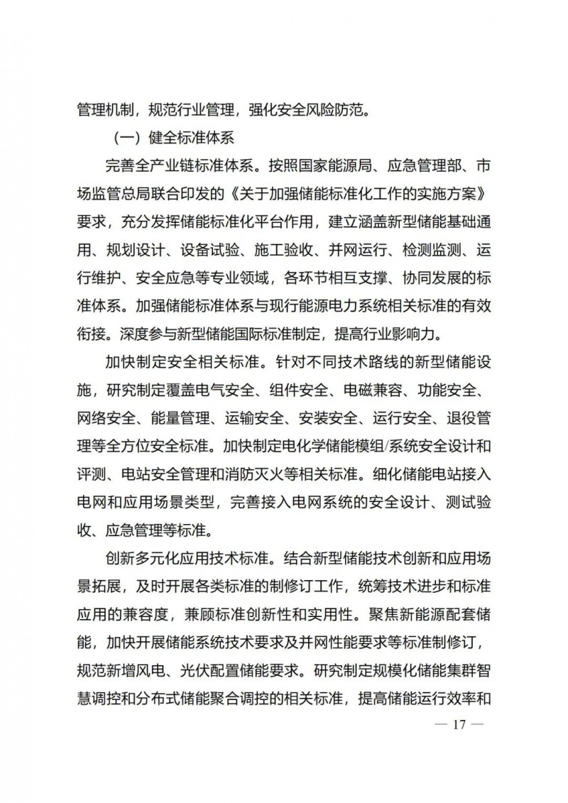 五是著力健全新型儲(chǔ)能管理體系。《實(shí)施方案》強(qiáng)化標(biāo)準(zhǔn)的規(guī)范引領(lǐng)和安全保障作用,完善新型儲(chǔ)能全產(chǎn)業(yè)鏈標(biāo)準(zhǔn)體系,加快制定安全相關(guān)標(biāo)準(zhǔn),開展多元化應(yīng)用技術(shù)標(biāo)準(zhǔn)制修訂。要求加快建立新型儲(chǔ)能項(xiàng)目管理機(jī)制,規(guī)范行業(yè)管理,強(qiáng)化安全風(fēng)險(xiǎn)防范。鼓勵(lì)各地加大新型儲(chǔ)能技術(shù)創(chuàng)新和項(xiàng)目建設(shè)支持力度,完善相關(guān)支持政策。加快建立新型儲(chǔ)能項(xiàng)目管理機(jī)制,強(qiáng)化安全風(fēng)險(xiǎn)防范,規(guī)范項(xiàng)目建設(shè)和運(yùn)行管理。