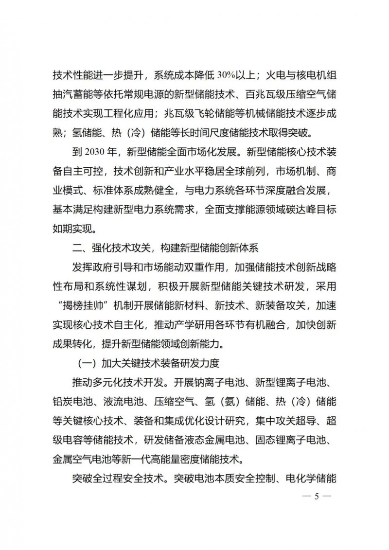 一是注重系統(tǒng)性謀劃儲(chǔ)能技術(shù)創(chuàng)新?!秾?shí)施方案》對(duì)新型儲(chǔ)能技術(shù)創(chuàng)新加強(qiáng)戰(zhàn)略性布局和系統(tǒng)性謀劃,從推動(dòng)多元化技術(shù)開發(fā)、突破全過程安全技術(shù)、創(chuàng)新智慧調(diào)控技術(shù)三個(gè)層面部署集中技術(shù)攻關(guān)的重點(diǎn)方向,提出研發(fā)儲(chǔ)備技術(shù)方向,鼓勵(lì)不同技術(shù)路線“百花齊放”,同時(shí)兼顧創(chuàng)新資源的優(yōu)化配置;強(qiáng)調(diào)推動(dòng)產(chǎn)學(xué)研用的融合發(fā)展,以“揭榜掛帥”等方式推動(dòng)創(chuàng)新平臺(tái)建設(shè),深化新型儲(chǔ)能學(xué)科建設(shè)和復(fù)合人才培養(yǎng);建立健全以企業(yè)為主體、市場(chǎng)為導(dǎo)向、產(chǎn)學(xué)研用相結(jié)合的綠色儲(chǔ)能技術(shù)創(chuàng)新體系,充分釋放平臺(tái)、人才、資本的創(chuàng)新活力,增加技術(shù)創(chuàng)新的內(nèi)生動(dòng)力。