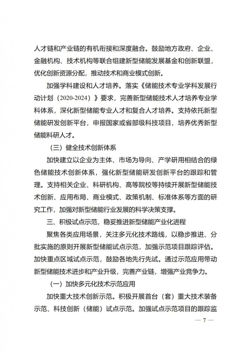 二是強(qiáng)化示范引領(lǐng)帶動(dòng)產(chǎn)業(yè)發(fā)展?!秾?shí)施方案》聚焦新型儲(chǔ)能多元化技術(shù)路線、不同時(shí)間尺度技術(shù)和各類應(yīng)用場(chǎng)景,以穩(wěn)步推進(jìn)、分批實(shí)施的原則推動(dòng)先進(jìn)儲(chǔ)能技術(shù)試點(diǎn)示范,加快首臺(tái)(套)重大技術(shù)裝備等重點(diǎn)技術(shù)的創(chuàng)新示范,以工程實(shí)踐加速技術(shù)迭代和更新,促進(jìn)成本下降;推動(dòng)重點(diǎn)區(qū)域開展區(qū)域性儲(chǔ)能示范區(qū)建設(shè),結(jié)合應(yīng)用場(chǎng)景積極推動(dòng)制定差異化政策,在一些創(chuàng)新成果多、體制基礎(chǔ)好、改革走在前的地區(qū)實(shí)現(xiàn)重點(diǎn)突破。結(jié)合新型儲(chǔ)能處于商業(yè)化初期階段實(shí)際,《實(shí)施方案》鼓勵(lì)各地在新型儲(chǔ)能發(fā)展工作中,堅(jiān)持“示范先行”原則,避免“一刀切”上規(guī)模,積極開展技術(shù)創(chuàng)新、健全市場(chǎng)體系和政策機(jī)制方面的試點(diǎn)示范。通過示范應(yīng)用帶動(dòng)技術(shù)進(jìn)步和產(chǎn)業(yè)升級(jí),推動(dòng)完善儲(chǔ)能上下游產(chǎn)業(yè)鏈條,支持儲(chǔ)能高新技術(shù)產(chǎn)業(yè)基地建設(shè)。