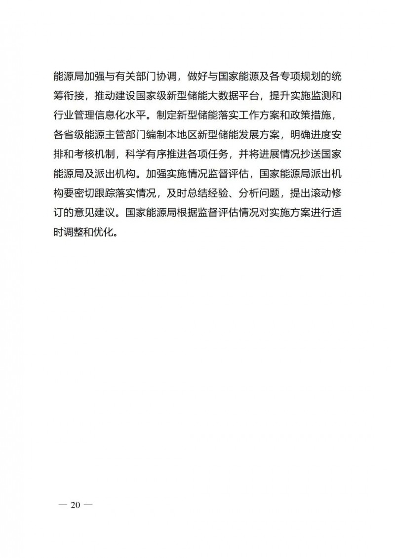 三)保障措施。為保障《實(shí)施方案》有效落地,提出系列具體保障措施。在協(xié)調(diào)保障方面,提出建立包含國(guó)家發(fā)展改革委、國(guó)家能源局與有關(guān)部門的多部門協(xié)調(diào)機(jī)制,做好與各項(xiàng)規(guī)模統(tǒng)籌銜接;在行業(yè)管理方面,提出建設(shè)國(guó)家級(jí)新型儲(chǔ)能大數(shù)據(jù)平臺(tái),開展實(shí)施方案各項(xiàng)重點(diǎn)任務(wù)監(jiān)測(cè),提升行業(yè)管理信息化水平;在責(zé)任落實(shí)方面,要求各省級(jí)能源主管部門編制新型儲(chǔ)能發(fā)展方案,明確各項(xiàng)任務(wù)進(jìn)度和考核機(jī)制。同時(shí),國(guó)家能源局根據(jù)監(jiān)督評(píng)估情況,適時(shí)對(duì)實(shí)施方案進(jìn)行優(yōu)化調(diào)整。
