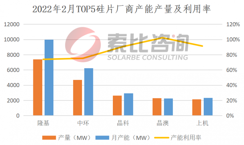 2022年2月,盡管一線企業(yè)開工率提升超過70%,但硅片仍供不應(yīng)求。2022年2月國內(nèi)硅片產(chǎn)量24.9GW,環(huán)比增長20.9%。按照產(chǎn)量排名,隆基、中環(huán)、晶科、晶澳、上機(jī)位列前五,企業(yè)總產(chǎn)量19.15GW,占比76.91%,綜合利用率86.6%。預(yù)計(jì)3月份硅片繼續(xù)維持供不應(yīng)求態(tài)勢。從供應(yīng)端來看,3月份基礎(chǔ)產(chǎn)量已達(dá)上限。從需求端來看,海外需求刺激預(yù)期將延續(xù)至3月底。