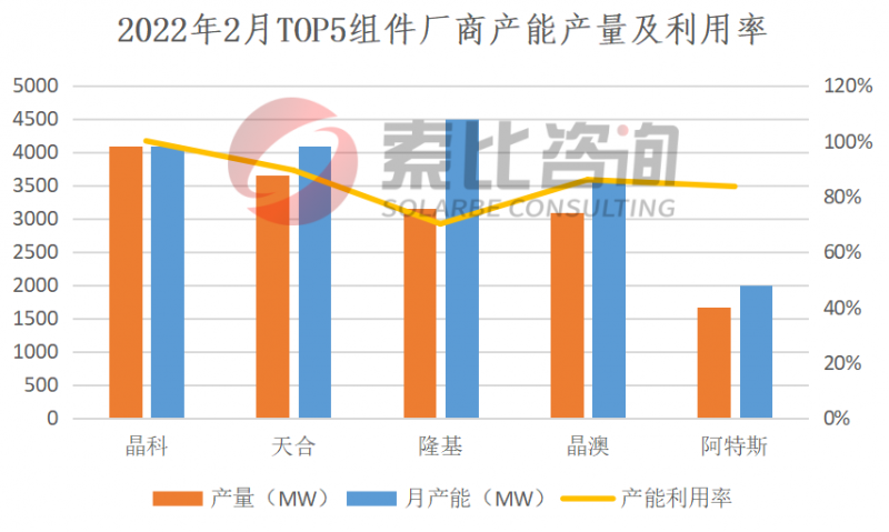 2022年2月,海內(nèi)外市場組件需求旺盛,國內(nèi)組件產(chǎn)量25.5GW,環(huán)比大增22.63%。一方面,國內(nèi)部分地面電站項(xiàng)目補(bǔ)裝、央國企組件開標(biāo)規(guī)模近40GW,一方面,印度即將實(shí)施新的關(guān)稅政策引發(fā)搶裝。按照產(chǎn)量排名,晶科、天合、隆基、晶澳、阿特斯位列前五,企業(yè)總產(chǎn)量15.63GW,占比61.29%,綜合開工率85.75%。預(yù)計(jì)2022年3月,組件需求和排產(chǎn)基本維持2月水平,國內(nèi)電站補(bǔ)裝及印度搶裝效應(yīng)逐步淡化。