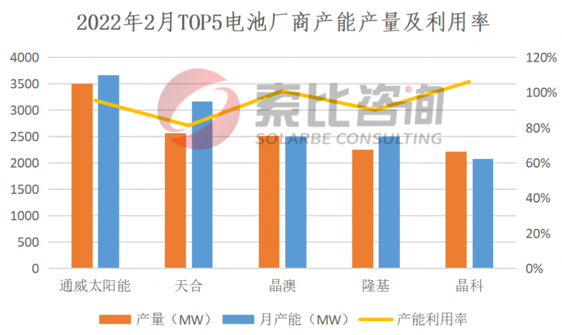 2022年2月,電池企業(yè)產(chǎn)量23.35GW,環(huán)比增長11.94%。按照產(chǎn)量排名,通威、天合、晶澳、隆基、晶科位列前五,企業(yè)總產(chǎn)量13.05GW,占比55.89%,綜合利用率94.7%。垂直一體化企業(yè)綜合利用率率84.12,主流電池企業(yè)綜合利用率73.96%。
