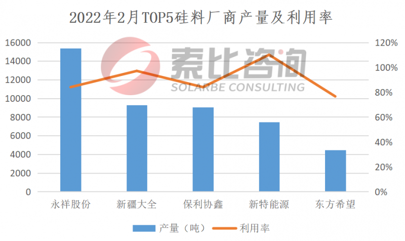 2022年2月,國內(nèi)13家多晶硅企業(yè)在產(chǎn),大全、永祥、協(xié)鑫、新特?cái)U(kuò)產(chǎn)增量釋放,產(chǎn)量小幅增加。2月份國內(nèi)多晶硅產(chǎn)量為5.23萬噸(約20.66GW),環(huán)比增長0.58%。按照產(chǎn)量排名,永祥、大全、協(xié)鑫、新特、東方希望位列前五,企業(yè)總產(chǎn)量4.57萬噸,占比87.4%,綜合利用率90.3%。索比咨詢預(yù)期3月份硅料產(chǎn)量繼續(xù)小幅上漲。從供應(yīng)端來看,國內(nèi)外終端需求上升,硅片企業(yè)開工率持續(xù)提升,硅料擴(kuò)產(chǎn)釋放亦有增量,預(yù)計(jì)3月份協(xié)鑫、永祥、新特等企業(yè)擴(kuò)產(chǎn)產(chǎn)能仍有釋放增量。從需求端來看,供應(yīng)量增長,價(jià)格有望松動(dòng),進(jìn)一步刺激下游需求。