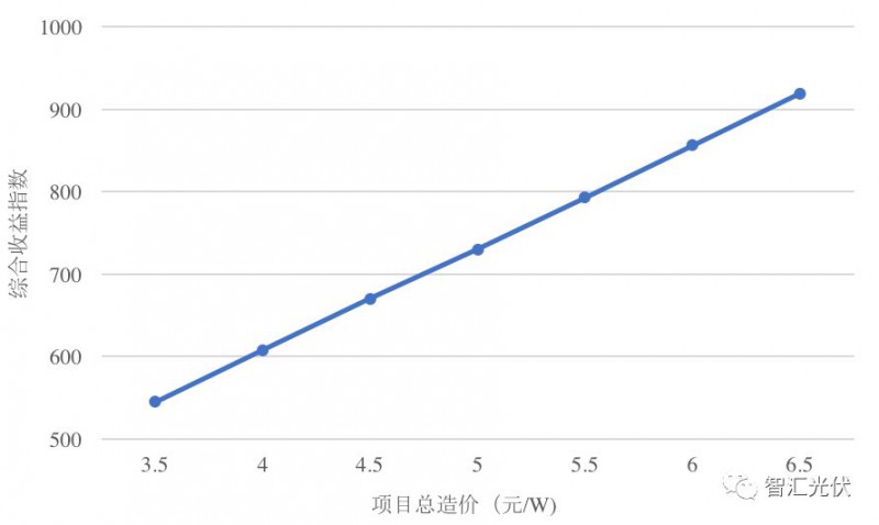 當(dāng)初始投資為4元/W時(shí),綜合收益指數(shù)(發(fā)電小時(shí)數(shù)×上網(wǎng)電價(jià))達(dá)到610時(shí),項(xiàng)目內(nèi)部收益率即可達(dá)到基準(zhǔn)收益率8%。