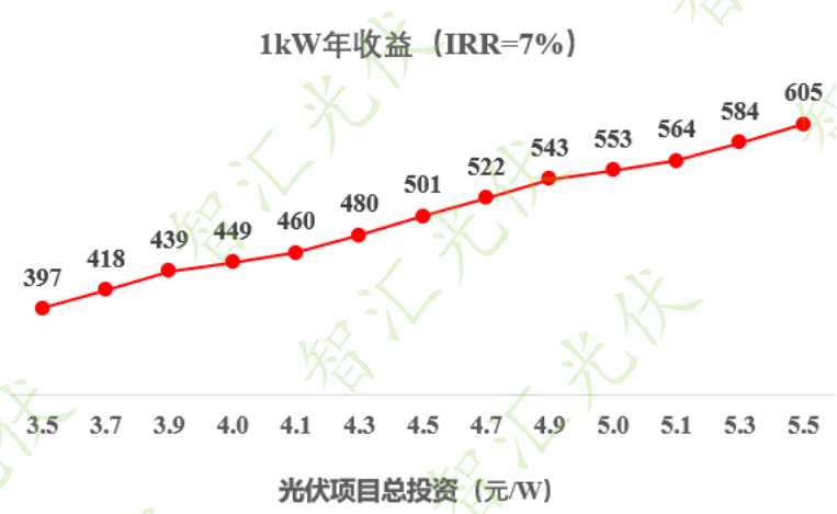 假設(shè)山東某地光伏項(xiàng)目,首年滿發(fā)小時(shí)數(shù)為1350小時(shí),山東的脫硫煤電價(jià)電價(jià)為0.3949元/kWh;該項(xiàng)目1kW年收益 = 1350*0.3949=533根據(jù)上表,533應(yīng)該介于總投資4.7元/W與4.9元/W之間。因此,項(xiàng)目總投資要控制在4.8元/W以內(nèi)時(shí),該項(xiàng)目全投資內(nèi)部收益率可以達(dá)到7%以上。假設(shè)內(nèi)蒙古蒙西某地光伏項(xiàng)目,首年滿發(fā)小時(shí)數(shù)為1700小時(shí),蒙西的脫硫煤電價(jià)電價(jià)為0.2829元/kWh;該項(xiàng)目1kW年收益 = 1700*0.2829=481根據(jù)上表,481對(duì)應(yīng)的總投資為4.3元/W。因此,項(xiàng)目總投資要控制在4.3元/W以內(nèi)時(shí),該項(xiàng)目全投資內(nèi)部收益率可以達(dá)到7%以上。如果所在企業(yè)收益率標(biāo)準(zhǔn)不是7%,而是6.5%,用同樣的方法,也可以計(jì)算出“1kW年收益”的對(duì)應(yīng)數(shù)值。