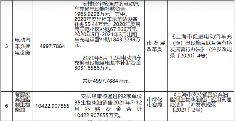 (四)按照《上海市支持餐廚廢棄油脂制生物柴油推廣應(yīng)用管理辦法》(滬發(fā)改規(guī)范〔2021〕2號(hào))規(guī)定,安排經(jīng)審核通過的2家單位B5生物柴油銷售2021年7-12月補(bǔ)貼資金合計(jì)10422.907855萬元。