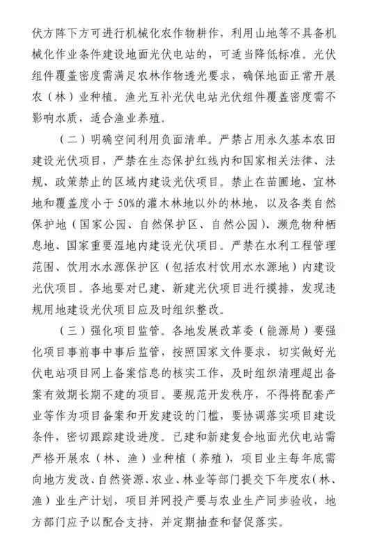 用地方面,允許在設(shè)施農(nóng)業(yè)上建設(shè)農(nóng)光互補、菌光互補項目,利用農(nóng)用地布設(shè)的光伏方陣可不改變原用地性質(zhì)。光伏復(fù)合項目應(yīng)堅持“以農(nóng)為先”,新建復(fù)合地面光伏電站光伏組件安裝高度最低處不低于2米,方陣前后陣列中心間距原則上不少于7米。嚴(yán)禁占用永久基本農(nóng)田、在生態(tài)保護紅線內(nèi)以及各類自然保護地建設(shè)光伏項目。此外,已建和新建復(fù)合地面光伏電站需嚴(yán)格開展農(nóng)(林、漁)業(yè)種植(養(yǎng)殖),項目業(yè)主每年底需向地方發(fā)改委、自然資源、農(nóng)業(yè)、林業(yè)等部門提交下年度農(nóng)(林、漁)業(yè)生產(chǎn)計劃,項目并網(wǎng)投產(chǎn)要與農(nóng)業(yè)生產(chǎn)同步驗收。
