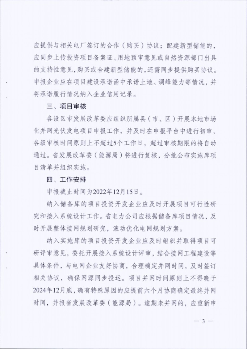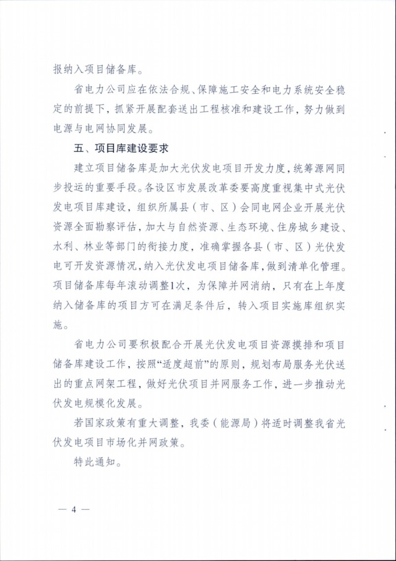儲(chǔ)備庫(kù)項(xiàng)目要及時(shí)開展可行性研究和接入系統(tǒng)設(shè)計(jì)工作,省電力公司要根據(jù)儲(chǔ)備庫(kù)項(xiàng)目及時(shí)開展整體接網(wǎng)規(guī)劃和研究。實(shí)施項(xiàng)目要合理確定并網(wǎng)時(shí)間,最晚在2024年12月底并網(wǎng),如有特殊情況可申請(qǐng)延遲半年。省電力公司要按照"適度超前”的原則,規(guī)劃布局服務(wù)光伏送出的重點(diǎn)網(wǎng)架工程。