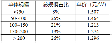 1)項目規(guī)模影響并非單體規(guī)模越大成本越低,單體規(guī)模在100~150MW的項目,是目前成本最低的。不同規(guī)模的光伏項目小EPC平均價格差異最高可達0.25元/W。