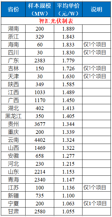 南方省份,如湖南、浙江、廣東最高,平均值在1.78~1.89元/W之間;