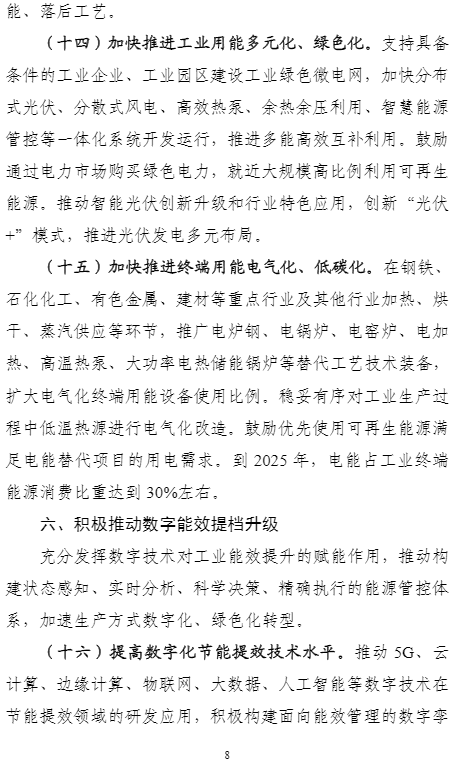 加快推進終端用能電氣化、低碳化。在鋼鐵、石化化工、有色金屬、建材等重點行業(yè)及其他行業(yè)加熱、烘干、蒸汽供應(yīng)等環(huán)節(jié),推廣電爐鋼、電鍋爐、電窯爐、電加熱、高溫熱泵、大功率電熱儲能鍋爐等替代工藝技術(shù)裝備,擴大電氣化終端用能設(shè)備使用比例。穩(wěn)妥有序?qū)I(yè)生產(chǎn)過程中低溫熱源進行電氣化改造。鼓勵優(yōu)先使用可再生能源滿足電能替代項目的用電需求。到2025年,電能占工業(yè)終端能源消費比重達到30%左右。
