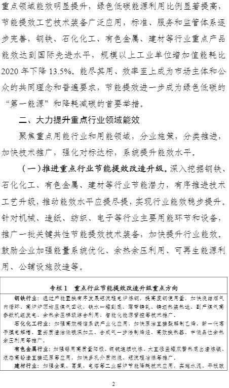 計劃提出,到2025年,重點工業(yè)行業(yè)能效全面提升,數(shù)據(jù)中心等重點領(lǐng)域能效明顯提升,綠色低碳能源利用比例顯著提高,節(jié)能提效工藝技術(shù)裝備廣泛應(yīng)用,標準、服務(wù)和監(jiān)管體系逐步完善,鋼鐵、石化化工、有色金屬、建材等行業(yè)重點產(chǎn)品能效達到國際先進水平,規(guī)模以上工業(yè)單位增加值能耗比2020年下降13.5%。能盡其用、效率至上成為市場主體和公眾的共同理念和普遍要求,節(jié)能提效進一步成為綠色低碳的“第一能源”和降耗減碳的首要舉措。