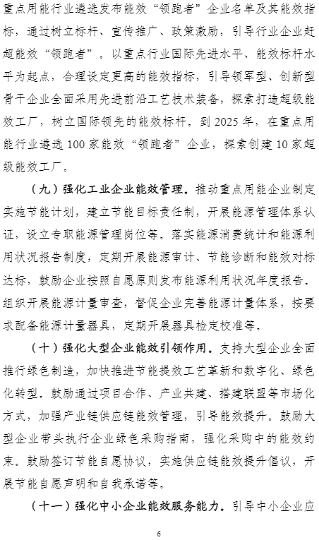 計劃提出,到2025年,重點工業(yè)行業(yè)能效全面提升,數(shù)據(jù)中心等重點領域能效明顯提升,綠色低碳能源利用比例顯著提高,節(jié)能提效工藝技術裝備廣泛應用,標準、服務和監(jiān)管體系逐步完善,鋼鐵、石化化工、有色金屬、建材等行業(yè)重點產(chǎn)品能效達到國際先進水平,規(guī)模以上工業(yè)單位增加值能耗比2020年下降13.5%。能盡其用、效率至上成為市場主體和公眾的共同理念和普遍要求,節(jié)能提效進一步成為綠色低碳的“第一能源”和降耗減碳的首要舉措。