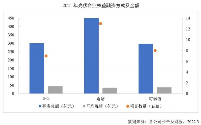 2021年我國光伏行業(yè)融資環(huán)境持續(xù)改善,共27家光伏企業(yè)在A股及港股資本市場使用權(quán)益融資方式募資,涉及權(quán)益融資項目28個,募資總額1058.33億元,同比增長48.2%。其中,再融資項目21個,募集資金758億元,同比增長30%;IPO上市融資項目7個,募集資金301億元,同比增長129.2%。截至2022年3月,2021年權(quán)益融資項目中,已完成融資合計700.77億元,同比增長16.3%。