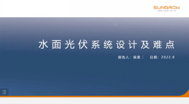 陽光水面光伏科技有限公司產(chǎn)品中心總監(jiān)吳昊作水面漂浮系統(tǒng)技術(shù)難點與分析。吳總監(jiān)全面講解了水面光伏的優(yōu)勢,水面光伏系統(tǒng)設(shè)計及難點,并分享了一些典型案例經(jīng)驗。