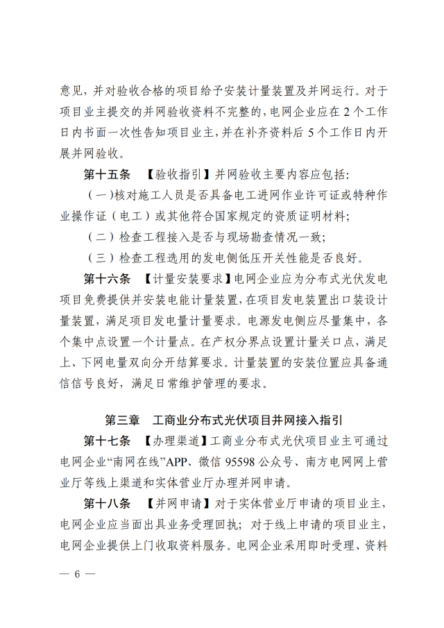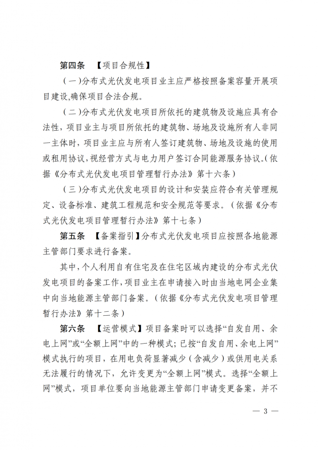 項(xiàng)目主要包括業(yè)主自建的戶用自然人分布式光伏項(xiàng)目和就地開發(fā)、就近利用且單點(diǎn)并網(wǎng)容量小于6兆瓦的戶用光伏以外的各類分布式光伏發(fā)電項(xiàng)目。文件從項(xiàng)目合規(guī)性、備案指引、運(yùn)營模式、接入電壓、并網(wǎng)流程等方面進(jìn)行了規(guī)定。本指引自印發(fā)之日起試行,有效期2年,內(nèi)容詳細(xì),對(duì)全國其他地區(qū)具有參考意義。