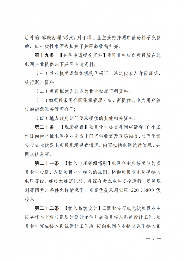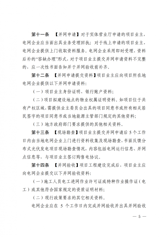 2、現(xiàn)行政策要求的其它相關(guān)資料。電網(wǎng)企業(yè)應(yīng)在5個(gè)工作日內(nèi)完成并網(wǎng)驗(yàn)收并出具并網(wǎng)驗(yàn)收意見,并對(duì)驗(yàn)收合格的項(xiàng)目給予安裝計(jì)量裝臵及并網(wǎng)運(yùn)行。對(duì)于項(xiàng)目業(yè)主提交的并網(wǎng)驗(yàn)收資料不完整的,電網(wǎng)企業(yè)應(yīng)在2個(gè)工作日內(nèi)書面一次性告知項(xiàng)目業(yè)主,并在補(bǔ)齊資料后5個(gè)工作日內(nèi)開展并網(wǎng)驗(yàn)收。