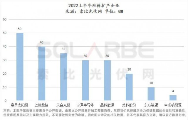 其中,高景太陽能擴產(chǎn)50GW直拉單晶硅棒,其次為上機數(shù)控擬建年產(chǎn)40GW單晶硅拉晶及配套生產(chǎn)項目,還有天合光能年產(chǎn)35GW的直拉單晶項目。