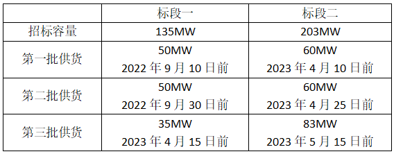 從招標(biāo)公告看,一、二標(biāo)段項目所在地均為新疆昌吉,其中一標(biāo)段招標(biāo)容量135MW,二標(biāo)段招標(biāo)容量203MW,對組件產(chǎn)品的要求均為雙面雙玻組件,峰值功率不低于540Wp。