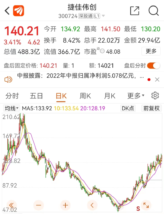 而此次減持計(jì)劃披露前,捷佳偉創(chuàng)股價走勢似乎復(fù)制了一年前的情況。在今年4月26日股價達(dá)到最低點(diǎn)47.02元/股之后,捷佳偉創(chuàng)股價便一路上揚(yáng)。截至10日收盤,其股價達(dá)到140.21元/股,較4月底最低股價漲幅達(dá)198.19%。