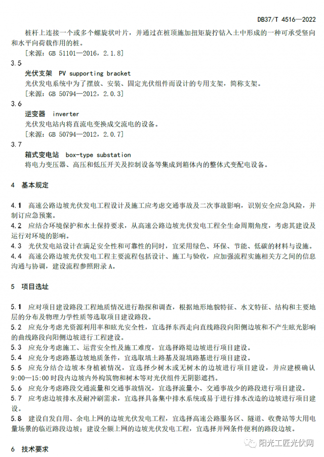 本標(biāo)準(zhǔn)綜合考慮了高速公路行車(chē)對(duì)邊坡光伏的技術(shù)要求,具有安全、環(huán)保、美觀、經(jīng)濟(jì)的技術(shù)特點(diǎn)。在安全性上,精心選用了低反光無(wú)眩光、防火防水防腐、不易碎、具有自清潔功能的輕質(zhì)柔性光伏組件和帶有自動(dòng)關(guān)斷功能的逆變器,采用柔性支架安裝,組件棱角使用柔性材料包裹,避免影響駕駛安全和二次事故傷害。在環(huán)保性上,設(shè)計(jì)了螺旋樁打孔施工技術(shù),減少對(duì)邊坡草皮的破壞。在美觀性上,注重光伏組件陣列與邊坡斜面外觀上的統(tǒng)一融合,視覺(jué)效果美觀、舒適。在經(jīng)濟(jì)性上,最大限度提高邊坡資源利用率,有利于規(guī)?;_(kāi)發(fā)。