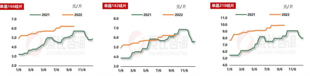 根據(jù)索比咨詢對多家電池片制造商的調(diào)研:就9月硅片價(jià)格行情來看,單晶166mm均價(jià)6.24元/片,較9月環(huán)比持平;單晶182mm均價(jià)漲至7.51元/片,較8月環(huán)比上漲0.27%;單晶210mm均價(jià)漲至9.91元/W,較8月環(huán)比上升0.20%。