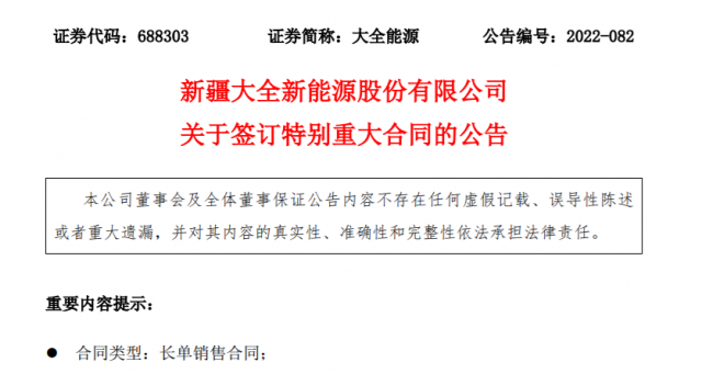 10月25日,大全能源公告,新疆大全新能源股份有限公司及全資子公司 內(nèi)蒙古大全新能源有限公司近日與某客戶簽訂了 《采購(gòu)框架合同》。