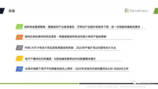 首先對產(chǎn)業(yè)鏈各環(huán)節(jié)2023年的市場量以及光伏裝機量進行預估。從數(shù)據(jù)上看,2023年硅料整體供應充足,不再是制約產(chǎn)業(yè)發(fā)展的瓶頸環(huán)節(jié)。硅片端因為高純石英砂的供應偏緊,從而造成了坩鍋產(chǎn)出的受限,這也將影響到硅片的實際產(chǎn)出。電池片環(huán)節(jié)因為2022年下半年以來,新建產(chǎn)能主要還是以n型技術為主,新技術產(chǎn)能釋放具有較大不確定性。PERC的產(chǎn)能擴張?zhí)幱谕顟B(tài),2023年大尺寸PERC電池片或將出現(xiàn)供需緊平衡的狀態(tài)。主要還是關注TOPCon電池片的實際產(chǎn)出。膠膜方面,poe粒子目前主要還是依賴進口,隨著n型需求的提升,poe粒子的供應端也會較為緊張。但是以上各環(huán)節(jié)在較高的資金刺激下,實際產(chǎn)出都具備了向上的彈性。所以綜合的產(chǎn)業(yè)鏈的實際產(chǎn)出數(shù)據(jù),我們預計2023年全球裝機量將在330-360GW之間。