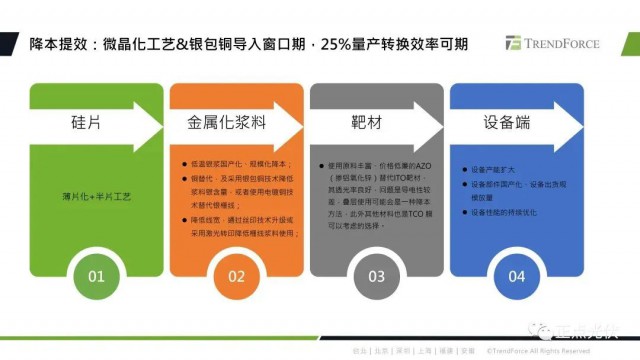 目前HJT技術降本增效的路徑還是比較確定的,硅片端主要是薄片化以及半片工藝的發(fā)展,金屬化漿料方面,包括低溫銀漿的國產(chǎn)化、規(guī)模化降本;銀包銅、電鍍銅上降低銀漿的耗量,靶材價格以及用量的下降,還有設備國產(chǎn)化、規(guī)?;当镜确矫妗?/p>