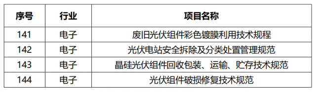 在公布的《2022年度工業(yè)節(jié)能與綠色標(biāo)準(zhǔn)研究項(xiàng)目清單》中,共包括鋼鐵、有色金屬、石化化工、建材、機(jī)械、汽車、輕工、紡織、電子、包裝、通信、船舶及綜合13個(gè)大類157項(xiàng)規(guī)范項(xiàng)目,其中在電子行業(yè),光伏電站的拆除、廢棄光伏組件的運(yùn)輸、包裝、貯存及修復(fù)等技術(shù)規(guī)范被納入其中,分別為《廢舊光伏組件彩色鍍膜利用技術(shù)規(guī)程》、《光伏電站安全拆除及分類處置管理規(guī)范》、《晶硅光伏組件回收包裝、運(yùn)輸、貯存技術(shù)規(guī)范》及《光伏組件破損修復(fù)技術(shù)規(guī)范》4項(xiàng)規(guī)范。