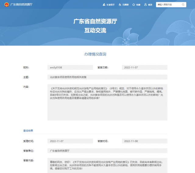 11月8日,廣東省自然資源廳公布了網(wǎng)友提問光伏復(fù)合項(xiàng)目使用農(nóng)用地相關(guān)政策的問題,并作出回答,詳情如下: